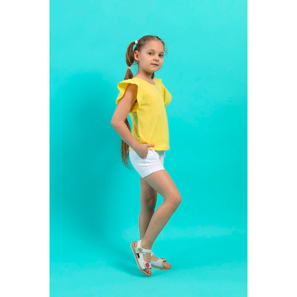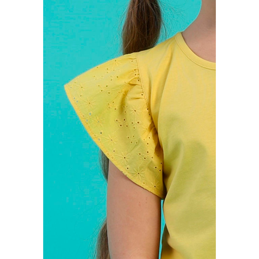 Кулирная гладь Футболка из кулирки с рукавами-крылышками из трендовой вышивки ришелье в цветок. Отлично подойдет для создания летних романических образов за счет воздушных рукавов и вышивки ришелье. Горловина обработана окантовочной бейкой из кулирки.100% хлопок