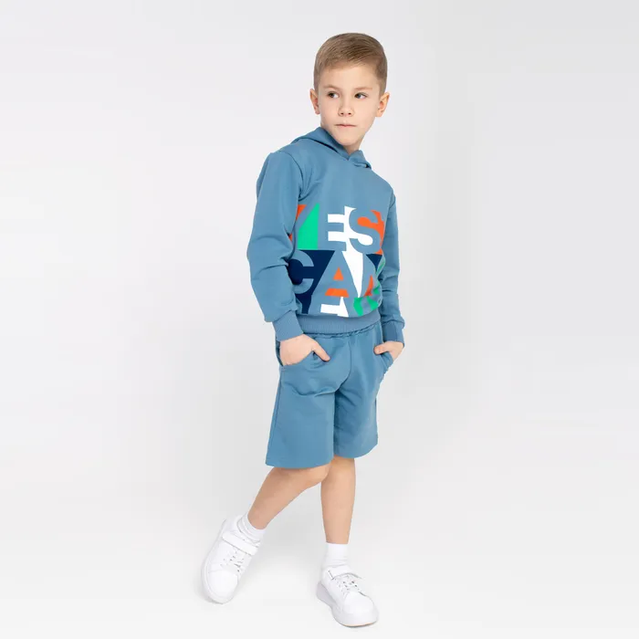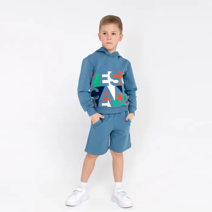 Спортивный комплект состоит из модного худи и шорт, которые могут использоваться как самостоятельные вещи или комбинироваться с другими элементами гардероба. Худи имеет свободный покрой с длинными рукавами и круглым вырезом горловины, капюшон. Шорты также имеют свободный крой и предусмотрены карманы по бокам для удобства хранения мелочей. Пояс на резинке обеспечивает хорошую посадку и комфортную носку. Ткань костюма хорошо пропускает воздух. Гипоаллергенна и подходит для чувствительной кожи. Костюм отлично подойдет для ежедневного посещения детского сада, прогулок, спортивных тренировок. Игр на открытом воздухе. Он также может быть использован для домашнего отдыха. Костюмы подходят для повседневного использования.