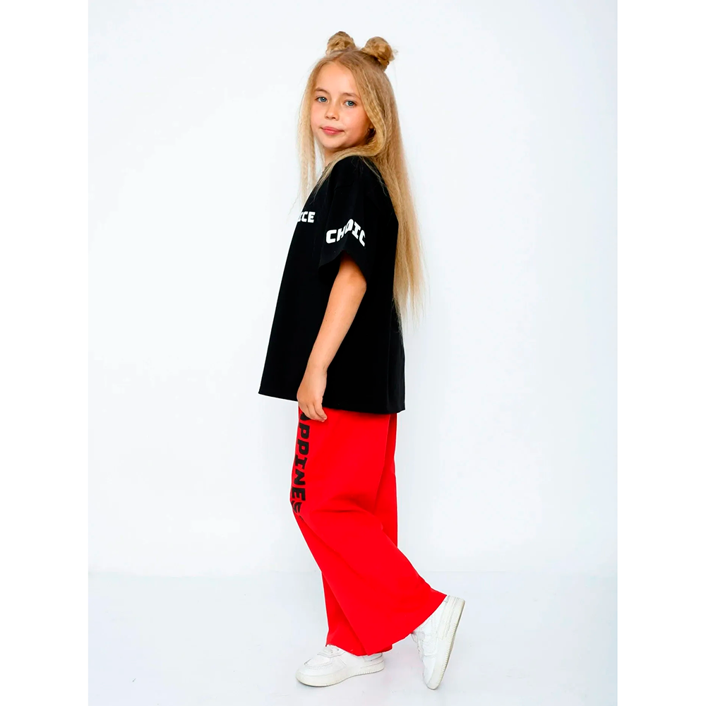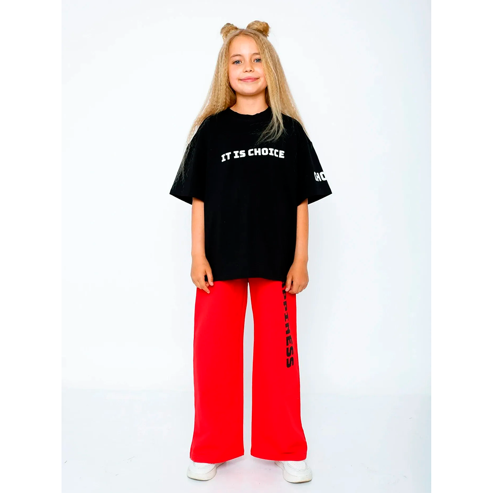 Стильный комтюм для девочки, состоящий из футболки и брюк. Футболка со спущенной линией плеча, по вороту – мягкая трикотажная манжета. Брюки широкого кроя на удобной мягкой резинке, по бокам – два внутренних кармана. Модель украшает модный принт на полочке, рукаве и на одной половинке штанов. Материал футболки – кулирка, материал брюк – футер 2-нитка.