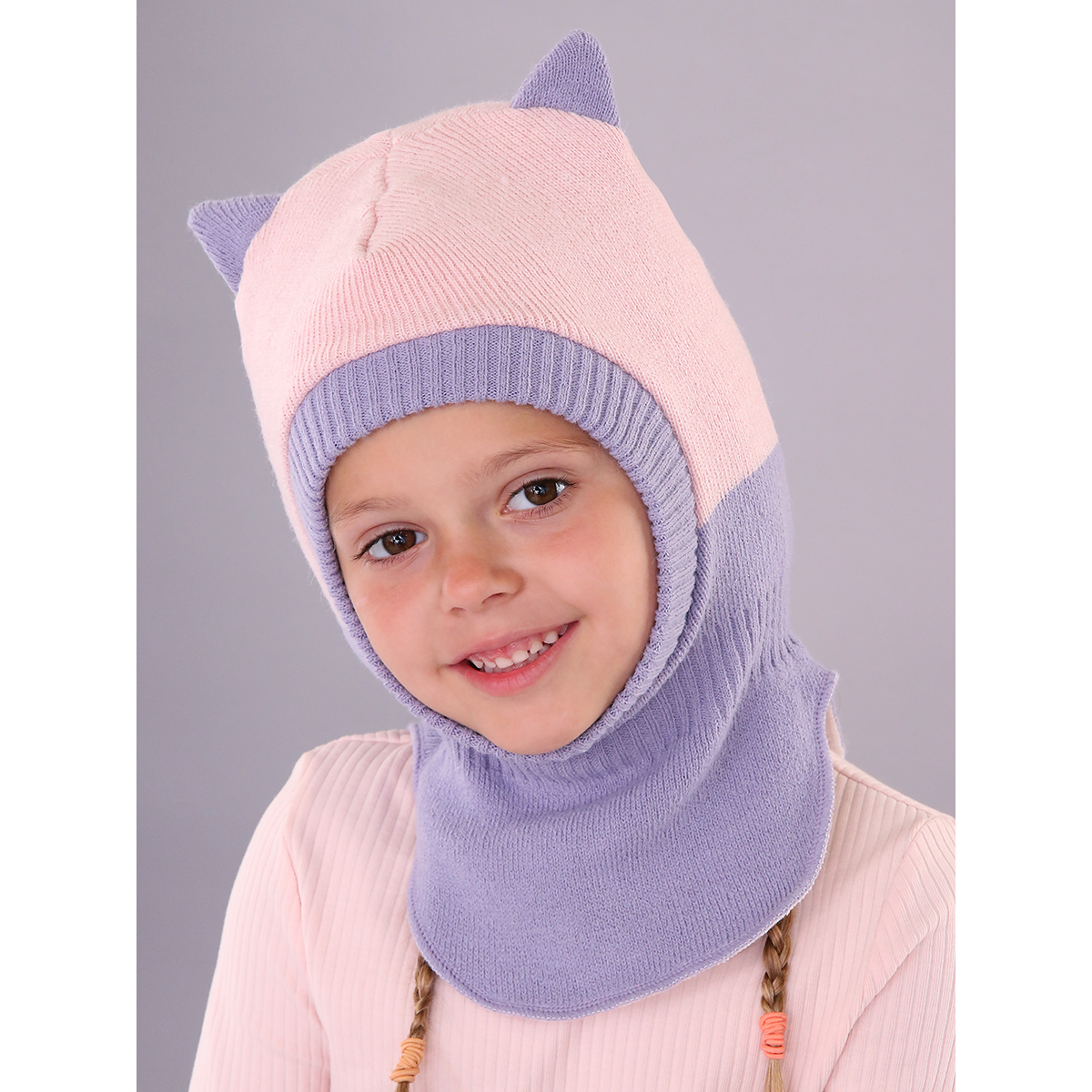 Шапка шлем на девочку с ушками цвет розовый-лиловый