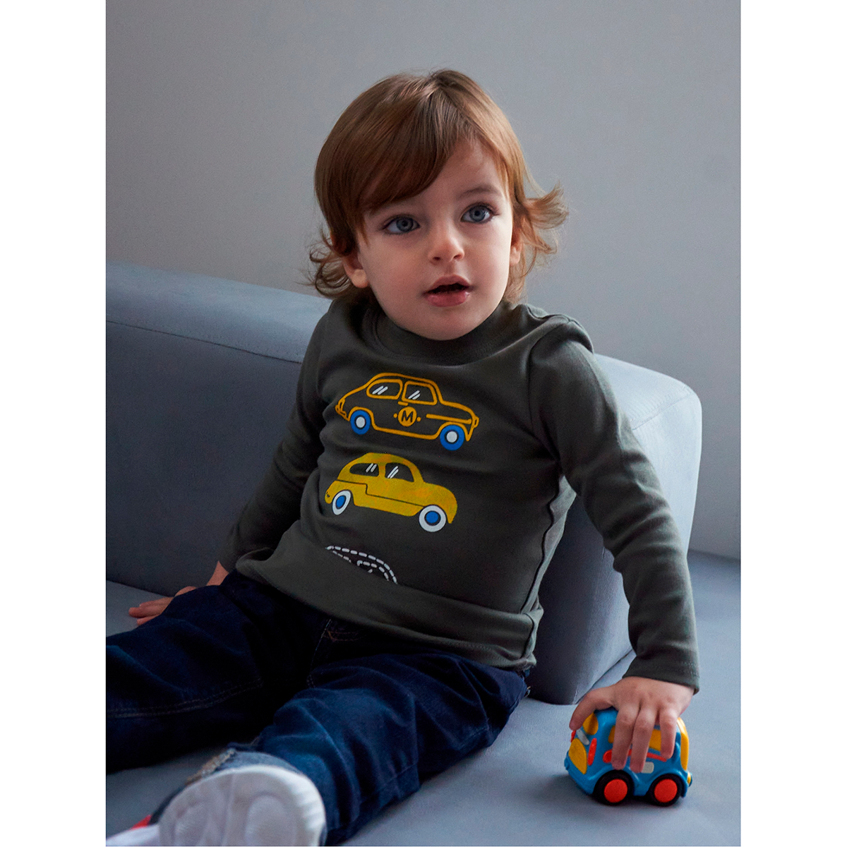 Лонгслив для ребёнка тёмно-коричневого цвета с ярким принтом: три стильных машинки жёлтого и белого цветов с синими колёсами. Практичный крой, длинные рукава — идеально для повседневной носки. Порадует маленьких любителей транспорта!