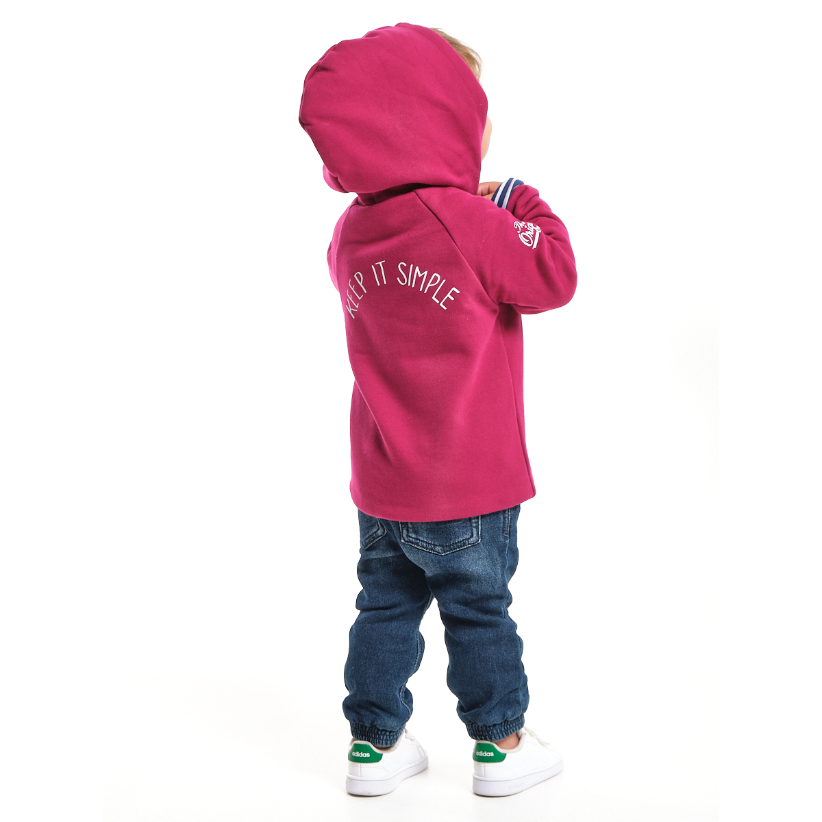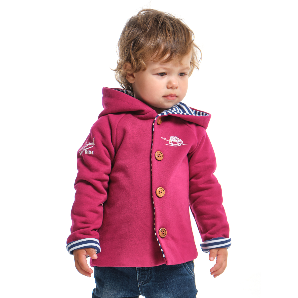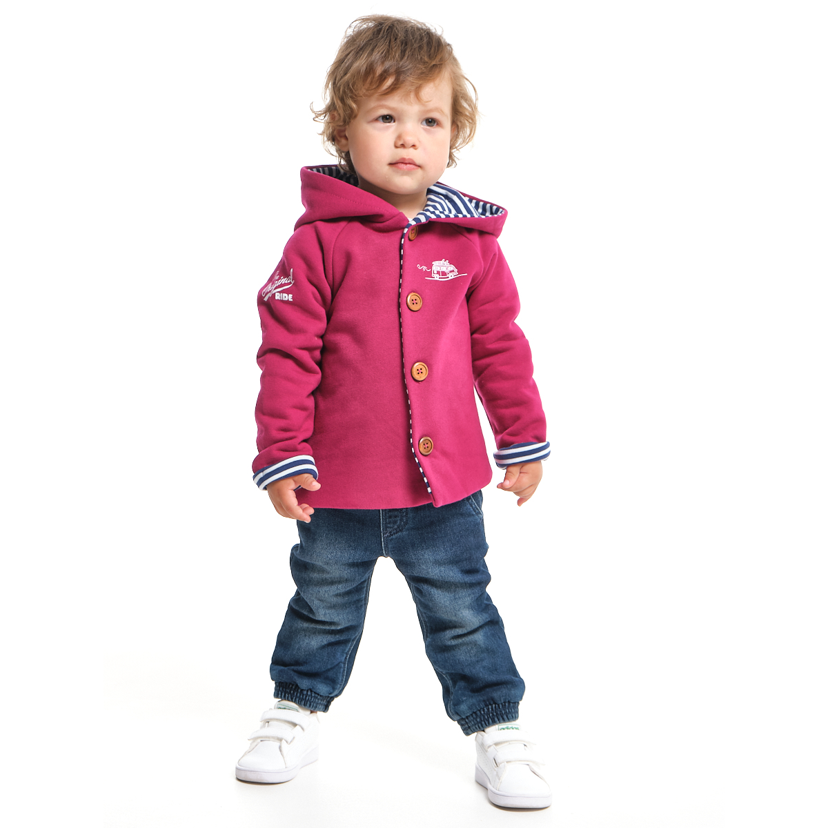 Детская куртка насыщенного розового цвета с капюшоном. Украшена крупными деревянными пуговицами. На рукаве — надпись «RIDE», на груди — небольшой рисунок. Манжеты и внутренняя часть капюшона оформлены в полоску (сине-белые оттенки). Практичная и стильная модель для ребёнка.