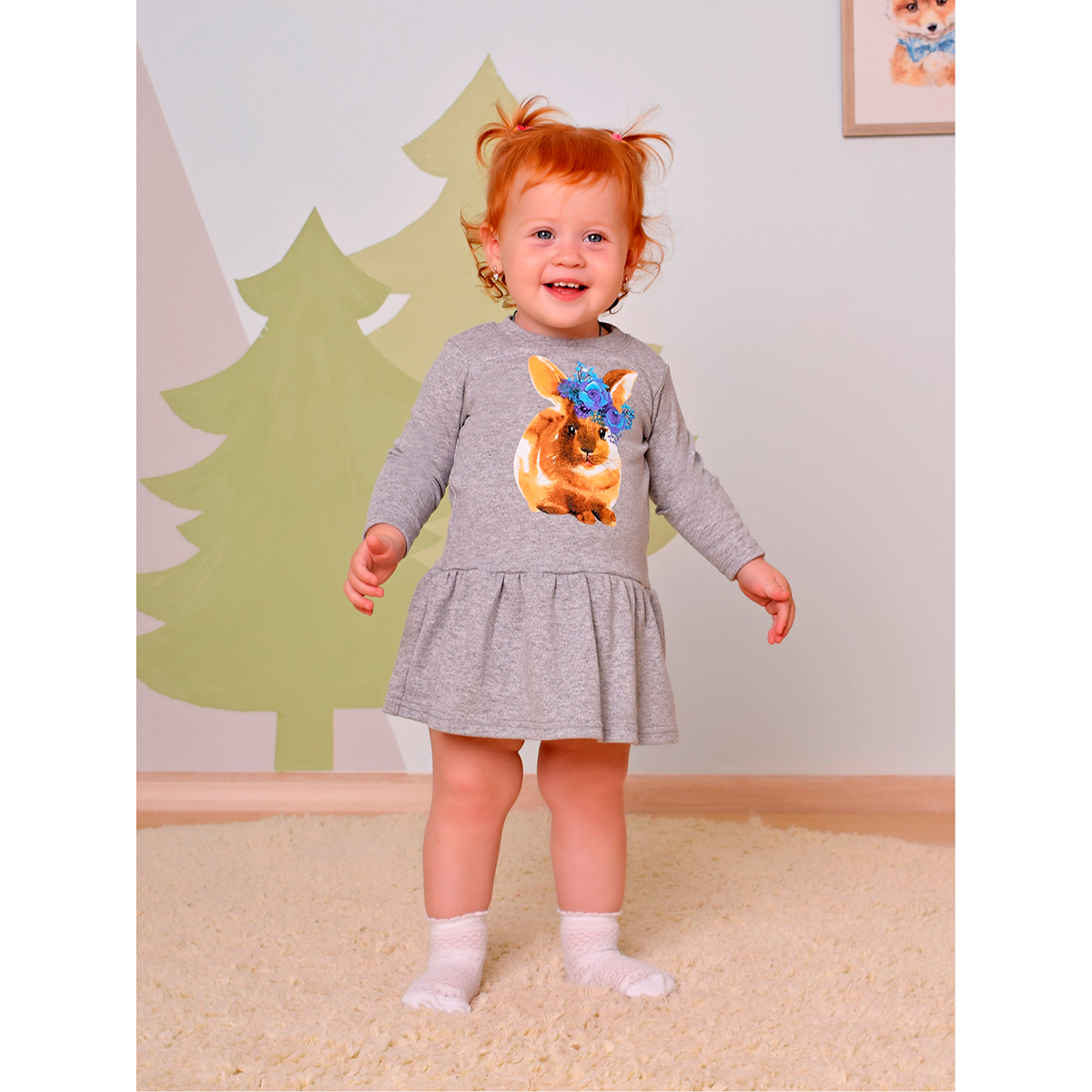 - Принт: центральный элемент — изображение пушистого зайчика с яркой цветочной короной. Милый рисунок придаёт платью игривость и делает образ особенным.