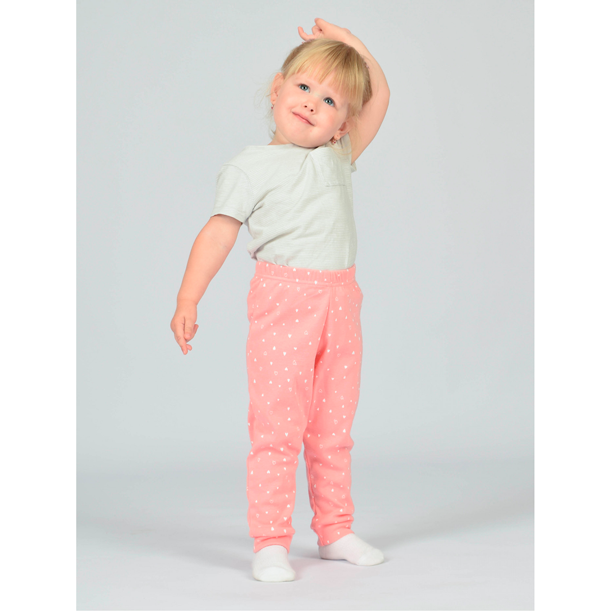 Детские брюки нежно-розового цвета с мелким белым принтом в виде сердечек. Модель выполнена из мягкого, эластичного материала, удобна для активных малышей. Имеют эластичный пояс и манжеты на щиколотках — надёжно держатся, не сковывают движения. Практичный и нежный вариант для дома или прогулок.