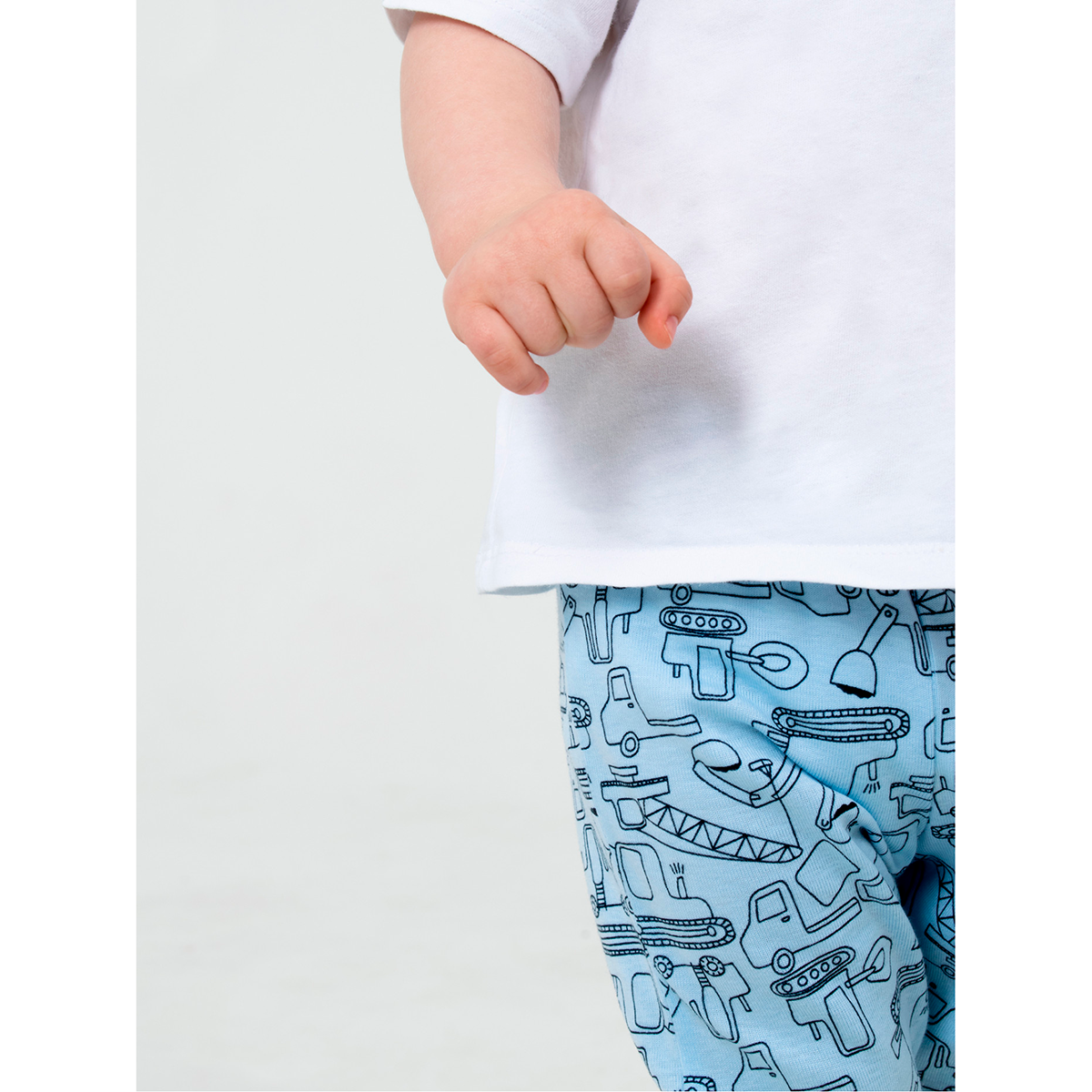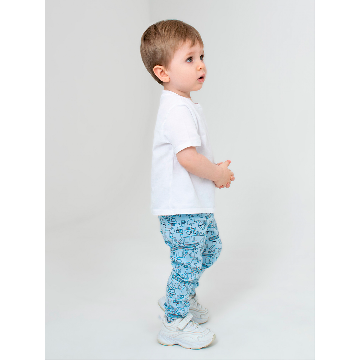 Нежно голубые брюки с забавным принтом (изображения техники и различных предметов). Выполнены из мягкого, эластичного материала, который комфортно облегает ноги и не сковывает движения.